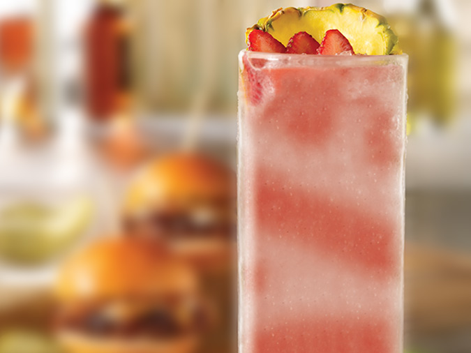 Premium coconut rum, premium spiced rum, strawberry purée, cream of coconut and pineapple juice.