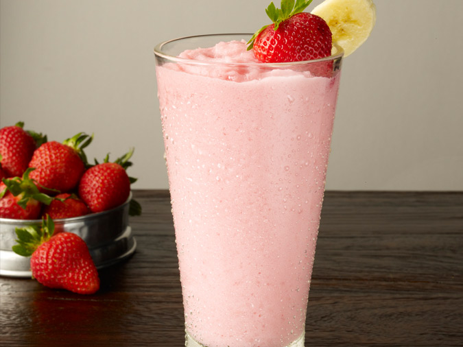 Strawberry-purée, fresh banana, grenadine, cream of coconut and pineapple juice.